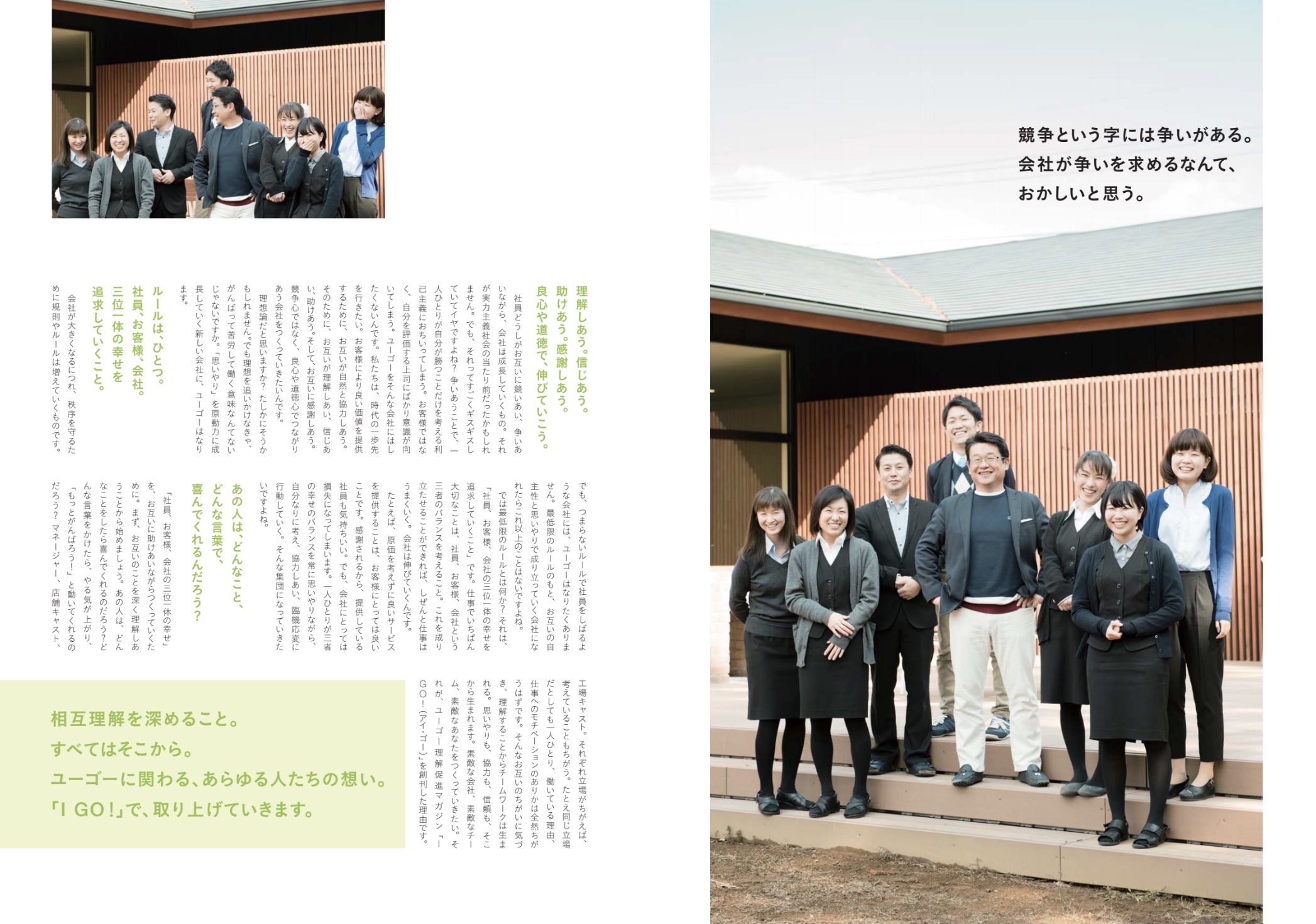 競争社会がどんなに加速しようとも、競い合い、争い合うのではなく、理解し合い、助け合うことで伸びていく。そんなユーゴーさま独自の組織観、人材観を社内で共有していくための社内報「I GO!」。沼崎社長の考えを丁寧に語ることはもちろん、さまざまなバックグラウンドを持ちながら働くスタッフさんたちの生の声を交えながら、「競争より共走」を表現しました。