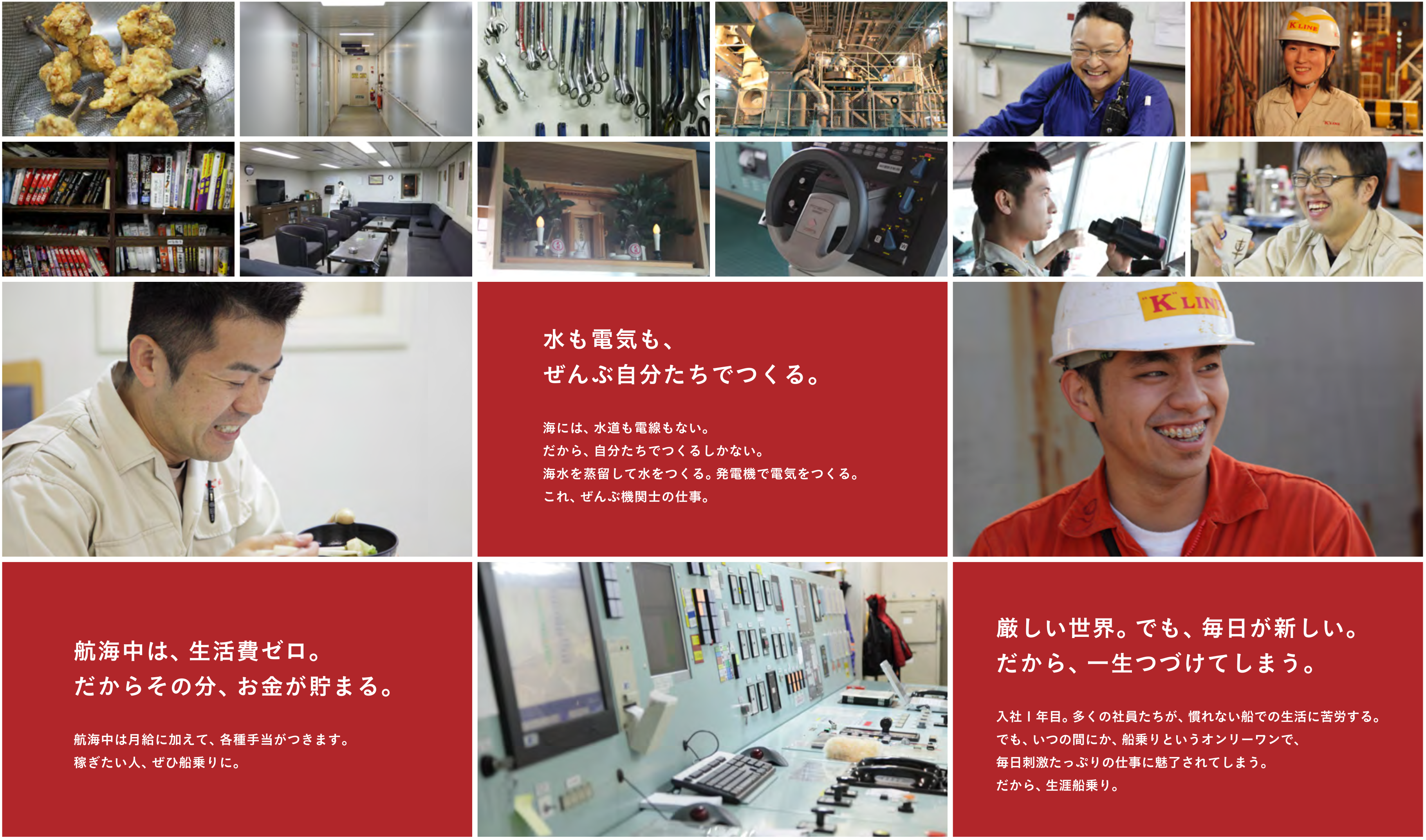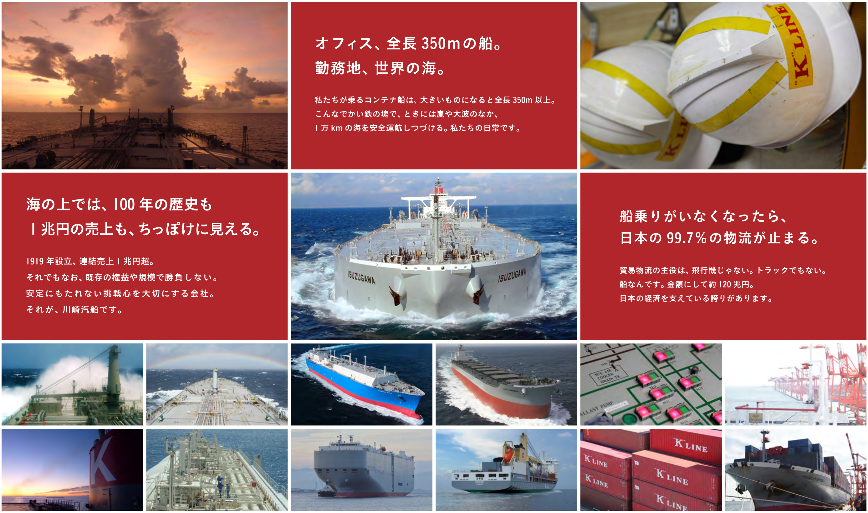 自社で知識・経験ゼロから航海士・機関士を育成している川崎汽船さま(https://www.kline.co.jp/ja/index.html)。船乗りたちのユニークでダイナミックな働き方、生き方を、A2サイズの大判リーフレットで表現しました。社員様取材は、川崎汽船さまの自社食堂でビールやお寿司をいただきながら実施。船乗りたちの豪快な生き方を垣間見た気がしました。撮影時は天候の関係で、コンテナ船がなかなか時間通りに寄港できず、時間内に撮影完了できるかハラハラしたのも、船乗りの会社ならではの良い思い出です。