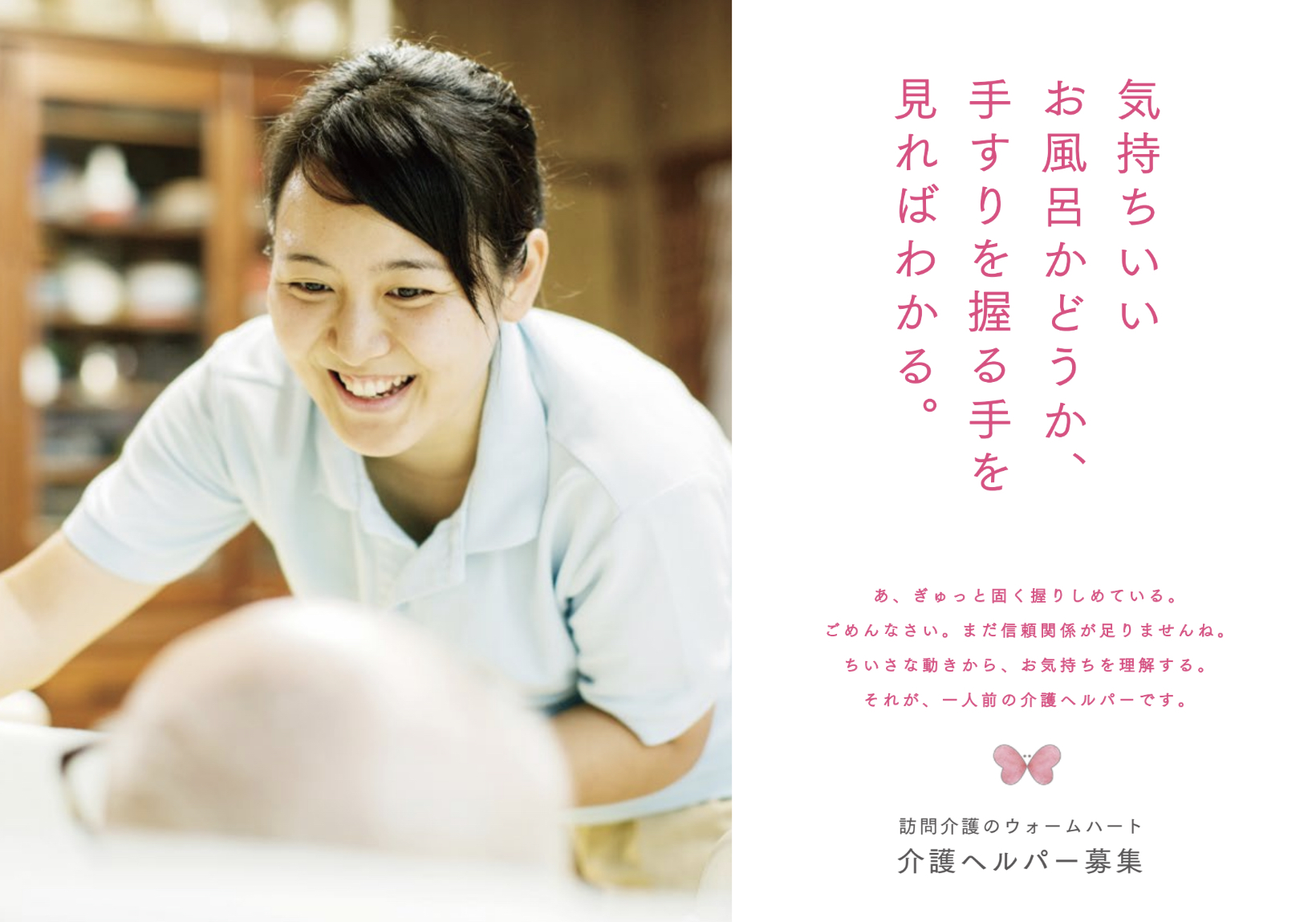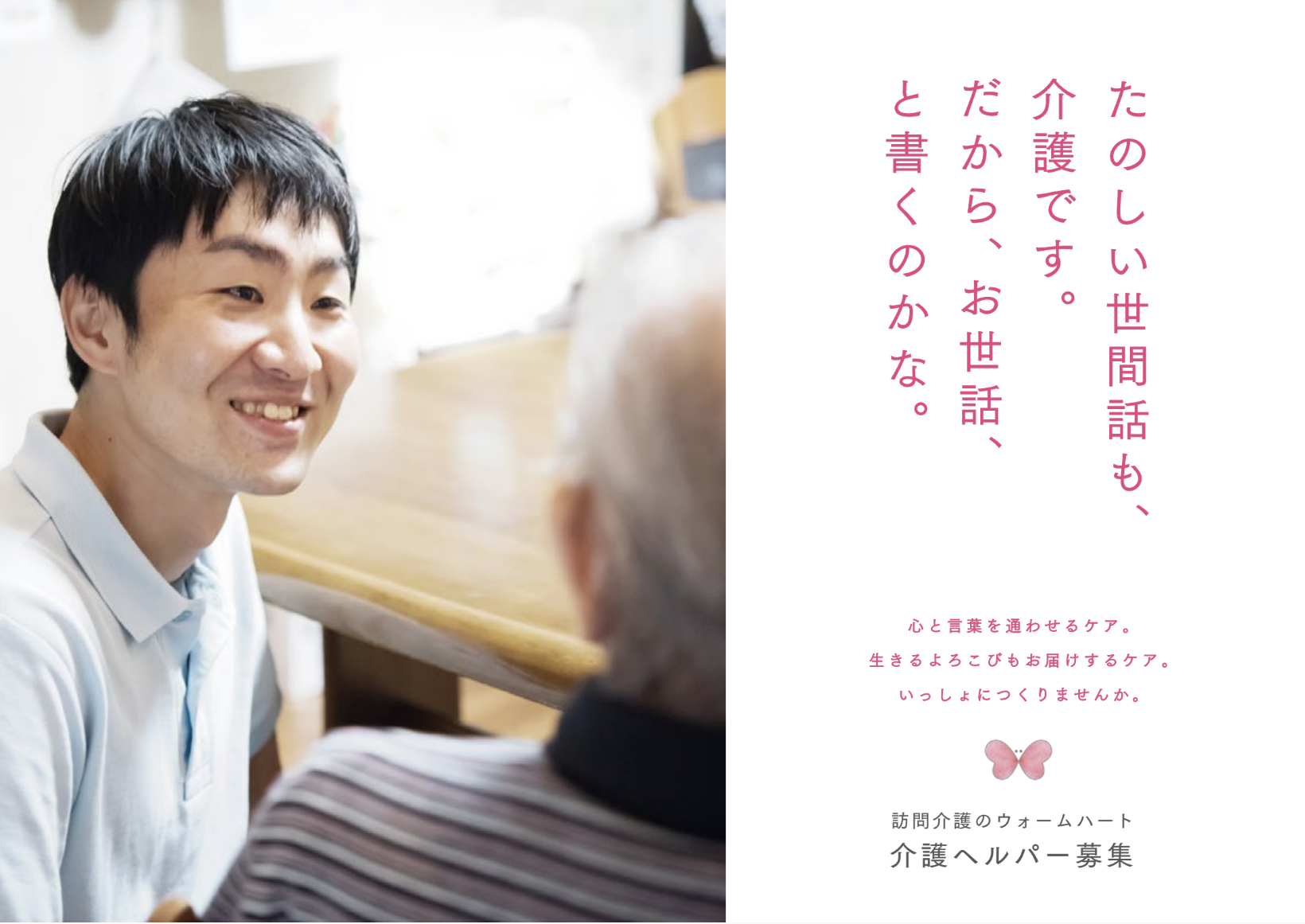 小さい事業所ながらも大手企業にはない、ヘルパーの方々一人ひとりの心の通った介護サービスが、ウォームハートさんの魅力。そんなウォームハートさんならではの介護へのポリシーや姿勢を伝えるポスターを作りました。